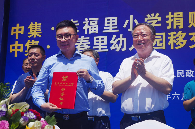 甘肅省慈善總會(huì)朱志良會(huì)長(zhǎng)向甘肅中集實(shí)業(yè)集團(tuán)有限公司董事長(zhǎng)周啟濤頒發(fā)榮譽(yù)證書